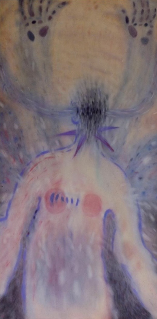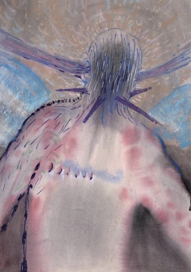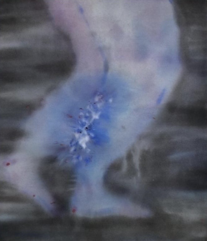 Jin Jiachen constructs "emotional archives" on cotton fabric using acrylic and pastel. Drawing from her experience in caregiving, she adopts a perspective of simultaneous participation and detachment. Her works explore how pain and vulnerability shape the body, transforming unspeakable trauma into visual metaphors that bloom like fireworks and dissipate like fog.