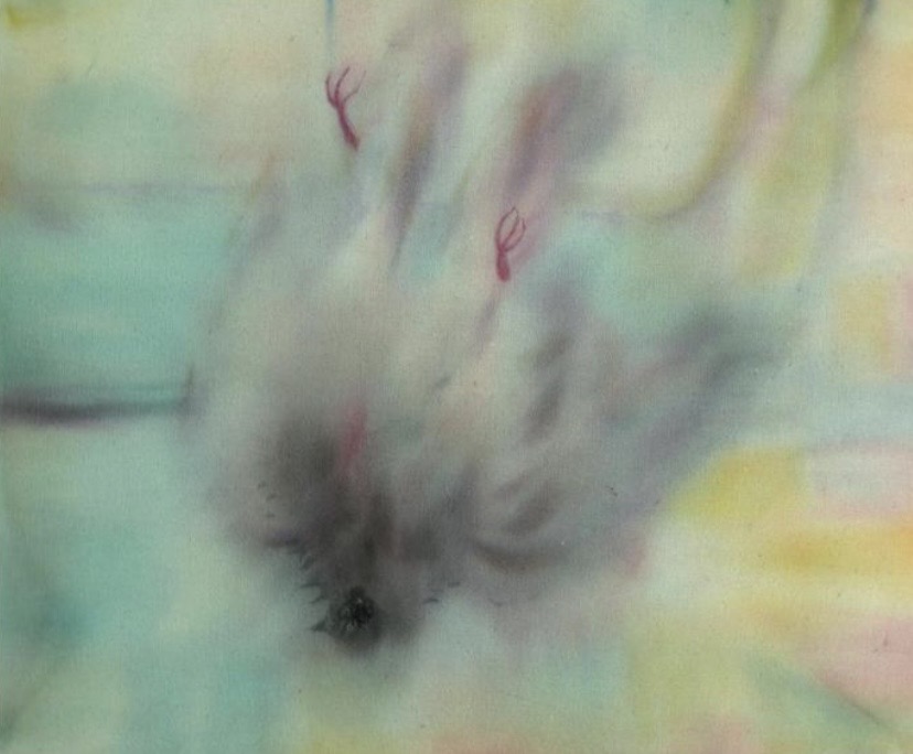 金佳辰以丙烯与色粉在棉布上构筑“情感档案”。她从看护疾病的经验出发,以既参与又抽离的视角,探讨疼痛与脆弱如何塑造身体,将无法言说的创伤化作如烟花绽放、如雾弥散的视觉隐喻。